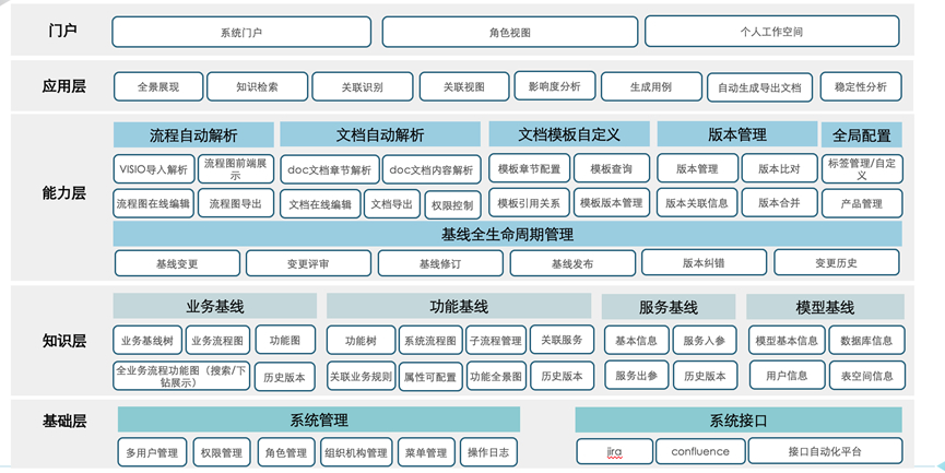 基于流程基线、功能基线、服务基线、模型基线等,梳理信息之间的关系,分企业级、系统级、功能级结构化展示